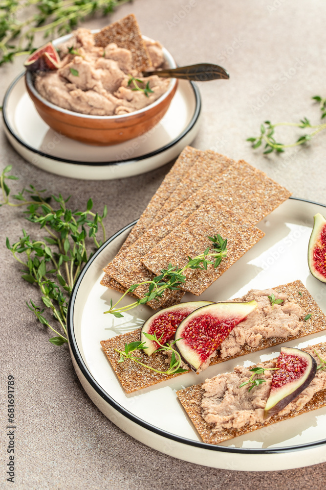 Fresh homemade chicken liver pate on a light background top view. copy space