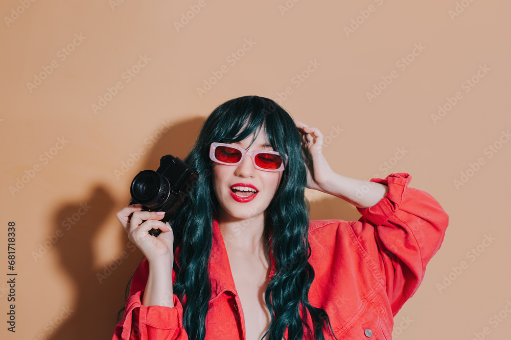 Cheeky shouting bright fashion girl with dark green long hair, bright red lips, top and sunglasses holding retro film camera on beige background. Trendy young hipster photographer, travel photo.