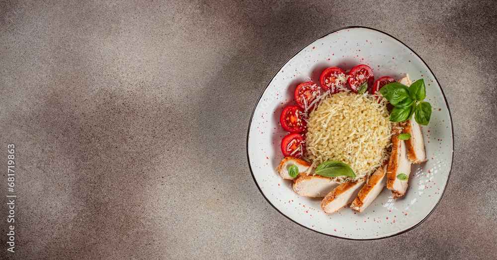 chicken breast with ptitim pasta, cherry tomatoes and cheese on a light background, Long banner format. top view. copy space for text