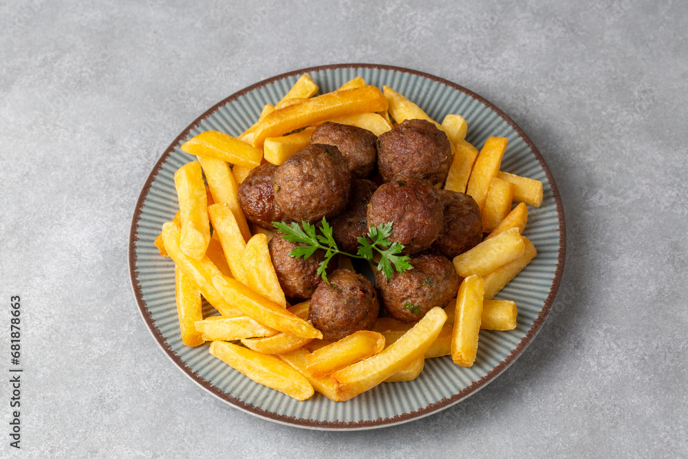 Round shaped balls of dry meatballs and french fries. Turkish name; kuru kofte ve patates