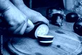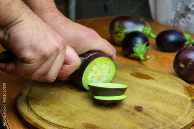 Close-up view of male hands cutting eggplant on chopping board in kitchen