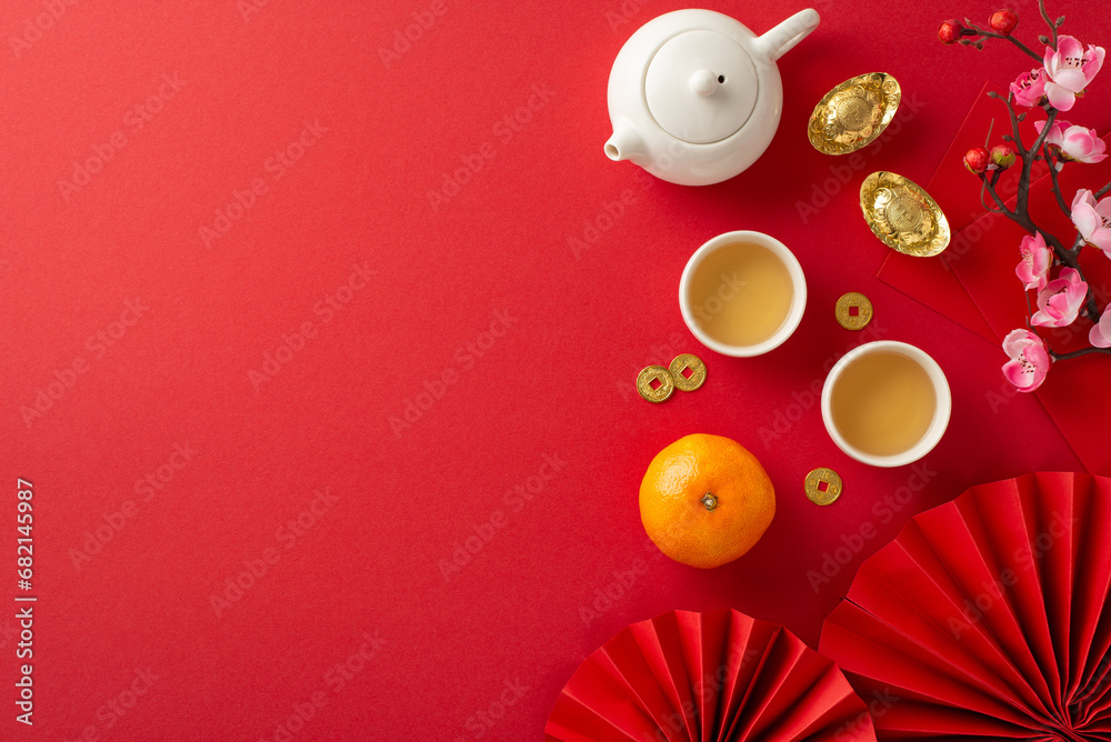 Thai-Chinese New Year Customs: top view tea ceremony display with Feng Shui items, fragrant jasmine tea symbolizing family unity in traditional celebration. Tangerine and sakura complete festive scene