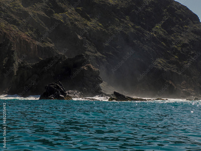 Landscape from the sea of Marguerite island coast over the pacific ocean volcanic rocks in baja california sur, mexico