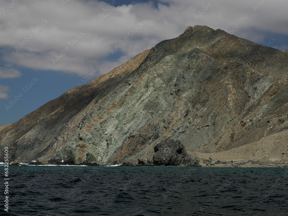 Landscape from the sea of Marguerite island coast over the pacific ocean volcanic rocks in baja california sur, mexico