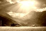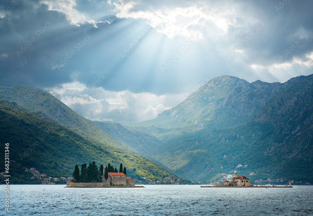 Our Lady of the Rock and St.George Island near town Perast, Montenegro. Beautiful evening view at sunset. Adriatic Sea. Perast, Kotor bay, Montenegro.