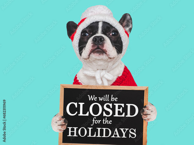 Signboard with the inscription We will be closed for the Holidays. Cute puppy. Closeup, indoors. Studio shot. Pets care concept