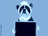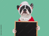 Happy Holidays. Lovable puppy and board for your congratulatory inscription. Closeup, indoors. Studio shot. Congratulations for family, relatives, loved ones, friends and colleagues. Pets care concept