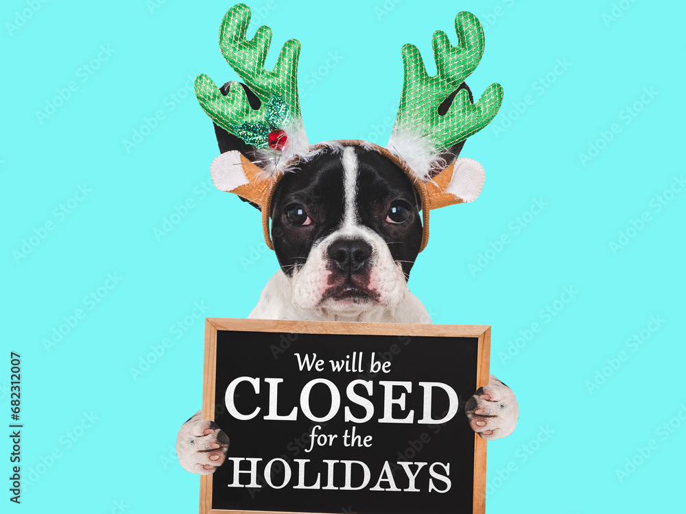 Signboard with the inscription We will be closed for the Holidays. Cute puppy. Closeup, indoors. Studio shot. Pets care concept