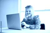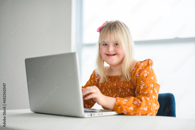 Girl with Down Syndrome doing homework at home, getting ready to go back to school