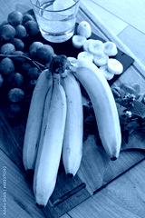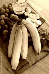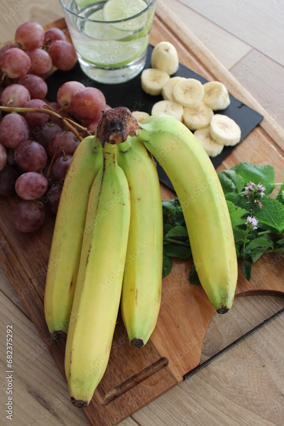 Régime de banane, bananes et fruits frais sur plateau en bois