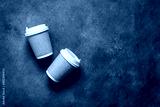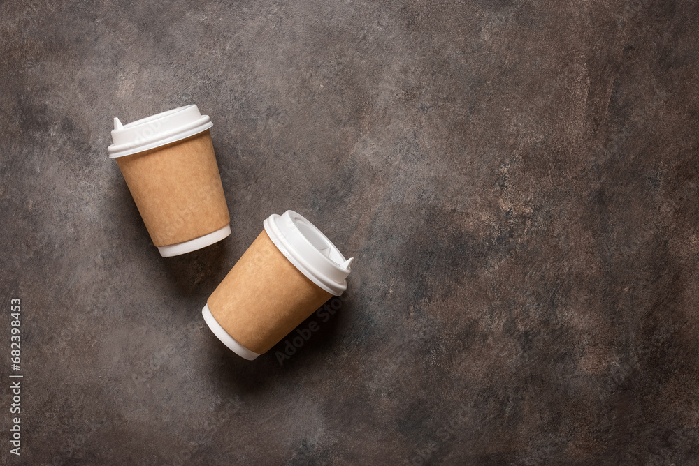 Coffee in paper cups lay flat on a dark brown background. View from above. Disposable tableware. Take-out drinks