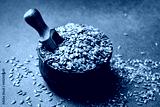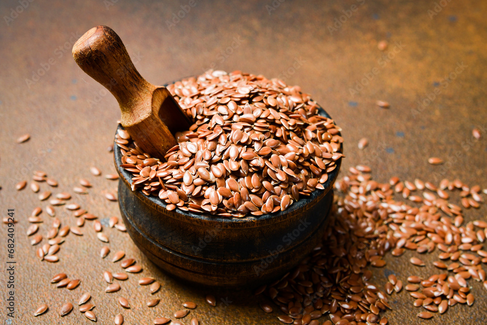 Flax seeds in a wooden bowl. Organic food, superfood. Top view.