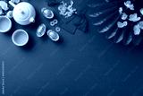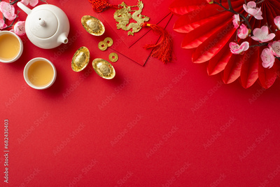 Lunar New Year Reunion Tradition. Top view table adorned with traditional Chinese New Year elements—red envelopes, decorative items, teapot set with cups on festive red backdrop, space for text or ads