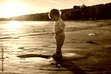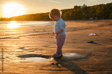 Little baby child toddler walks along an empty beach by the sea at sunset alone, calm and relax, active childhood