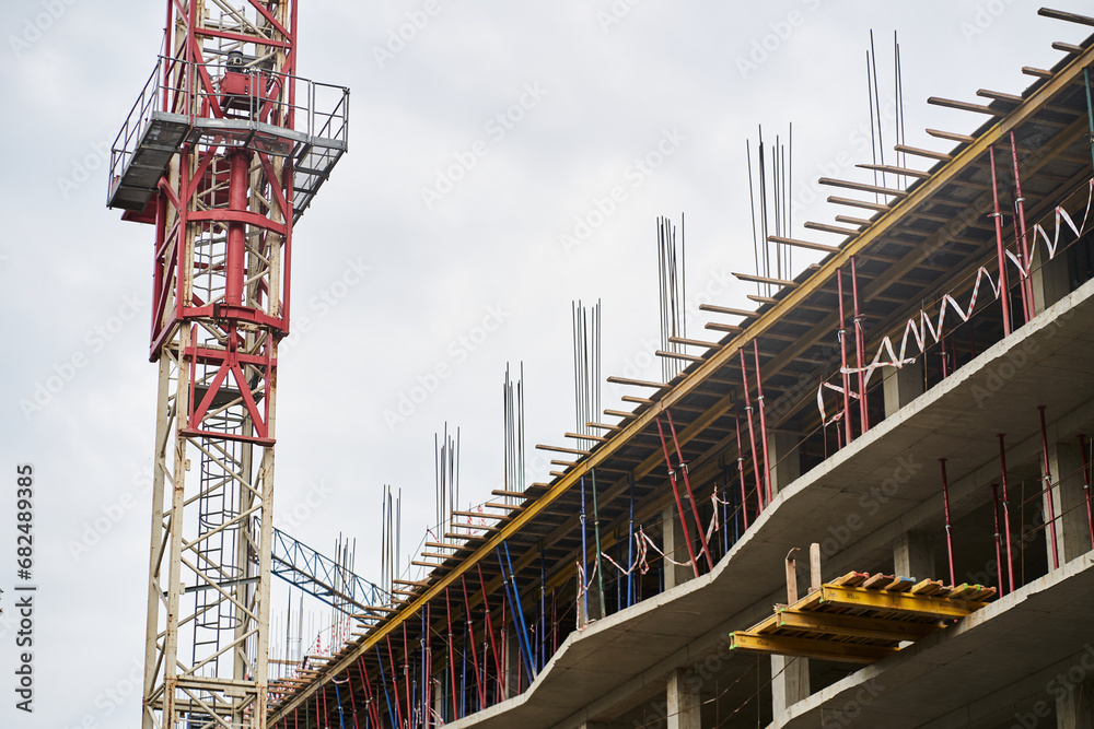 Construction of residential buildings. View of the construction of skyscrapers. Construction site with a tower crane. With space to copy. High quality photo