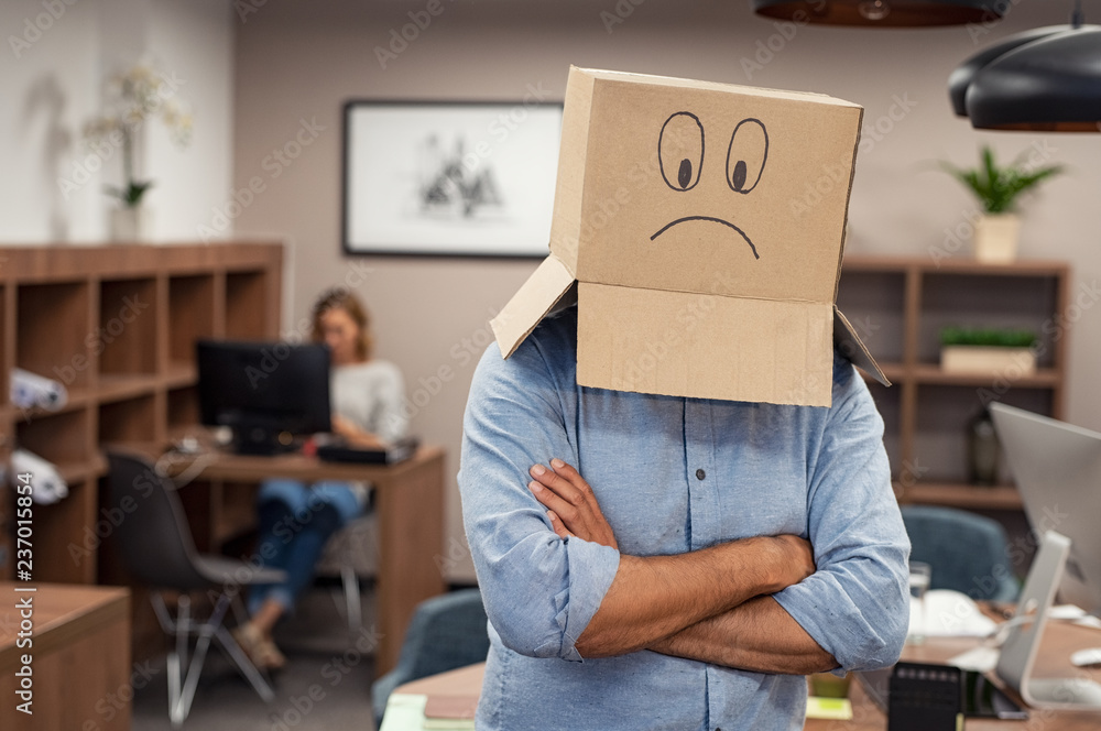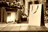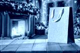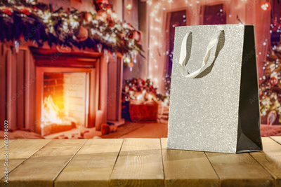 Gift bag on wooden table and free space for your decoration. Home interior with fireplace and window.