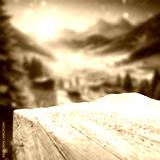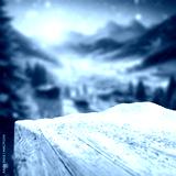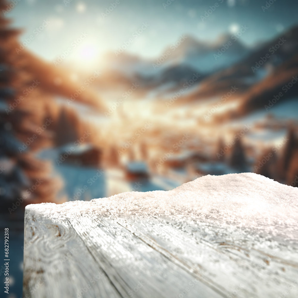 White old worn wooden table cover of snow flakes and empty space for your decoration. Winter landscape of mountains and christmas tree, cold december day, natural lights, Mockup background of new year