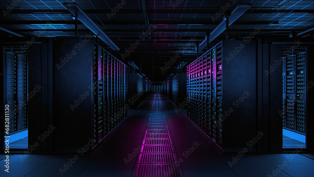 Modern Data Technology Center Server Racks Working in Dark Facility. Concept of Internet of Things, Big Data Protection, Storage, Cryptocurrency Farm, Cloud Computing. 3D Render of Crypto Miners.