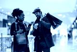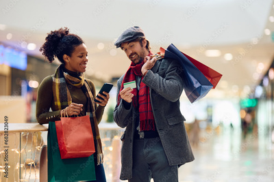 Happy multiracial couple using credit card and smart phone at shopping mall.