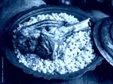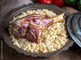 Turkish foods; lamb shank tandoori on bulgur wheat rice (Turkish name; bulgur bugday pilavi kuzu incik tandir)
