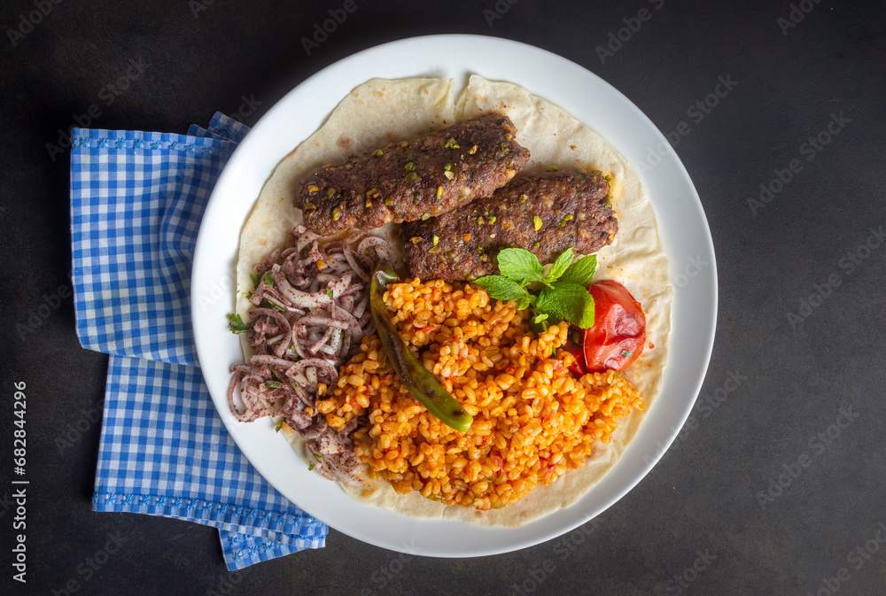 Traditional delicious Turkish cuisine, kebab type belonging to Adana and Antep regions, grilled pistachio kebab. Turkish name; fistikli kebab