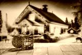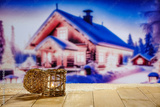 Board of free space and christmas lamp with candle. Mockup background of winter time. New year and december time at night.