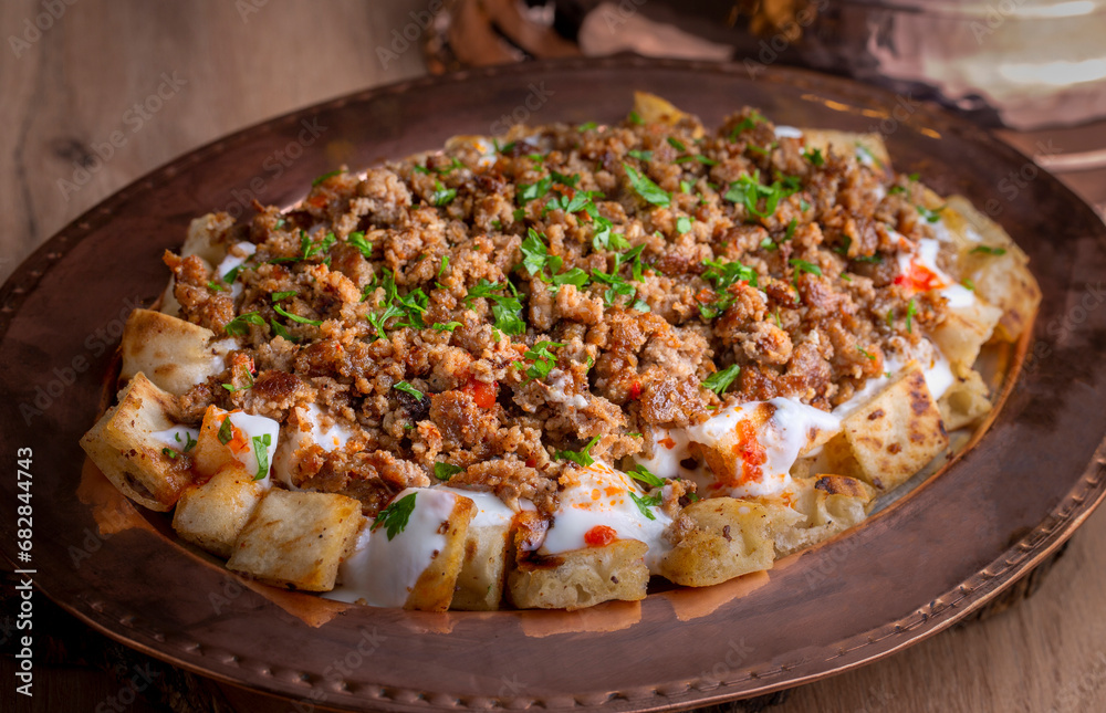 Turkish traditional food of Kastamonu tirit meal, yoghutr and bread. Turkish name; tirit kebabi
