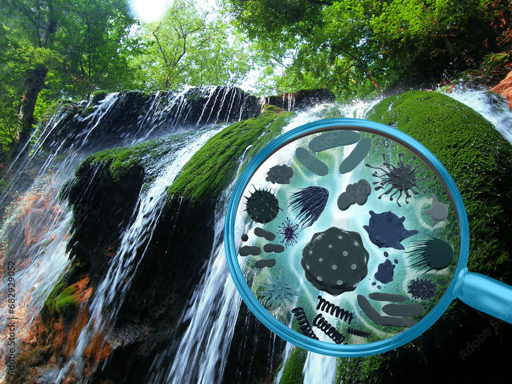 Magnifying lens with simulated plankton, germs, viruses, bacteria in a mountain river, in a waterfall. Coast with water, stones, algae