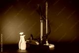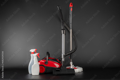 Cleaning concept, vacuum cleaner, mop. Cleaning products and spin mop with red details on the floor in the grey-black background