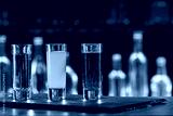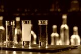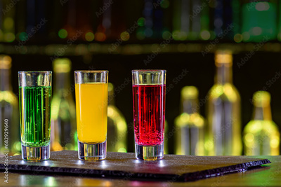 Cocktails Party Shots and Shooters on bar counter in a restaurant, pub. Miniature mixed drinks. Alcoholic cooler beverage at nightclub on dark background