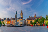 La Grand Place square in Lille city center, historical monument Flemish mannerist style buildings, Column of Goddess, Vieille Bourse in the evening, French Flanders, Nord department, Northern France