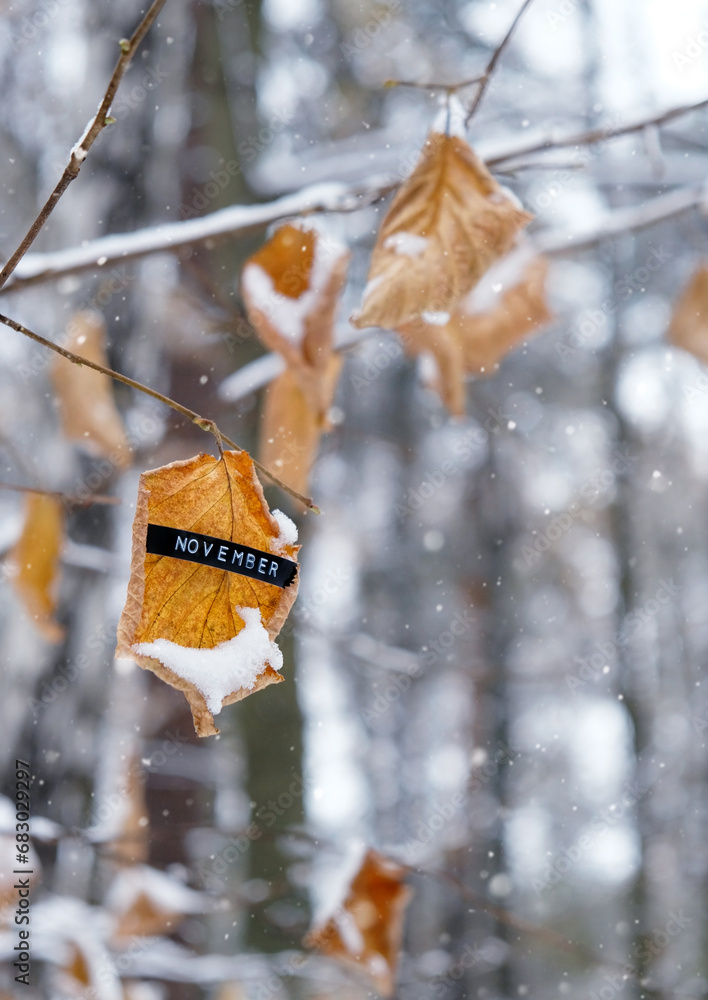 Late autumn background. November time. snowy Dry leaves on tree close up in forest. November month calendar concept. first snow fell. cold weather