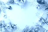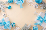 Unlock the wonder of uncovering the perfect Christmas treasures. Top view flat lay of gift boxes, tree ornaments, frosty fir branches, snowflakes on beige background with advert spot