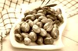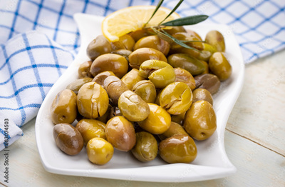 Cracked green olives. Cracked green olives with lemon. Turkish style olive (Turkish name; kirma zeytin)