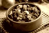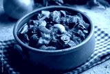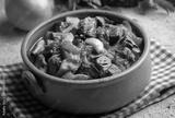 Top view of Turkish dish Guvech - baked meat with eggplant and traditionally served in earthenware pot (Turkish name; etli patlican guvec)
