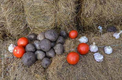 Fresh farm vegetables on the rustic dry straw background. Beets, tomatoes and garlic. Autumn harvest farmers
