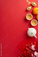 Dive into richness of Chinese New Year with sumptuous table setting. Overhead vertical shot of ornate fans, green tea accessories, Feng Shui symbols, citrus, sakura on red canvas, ready for your ad