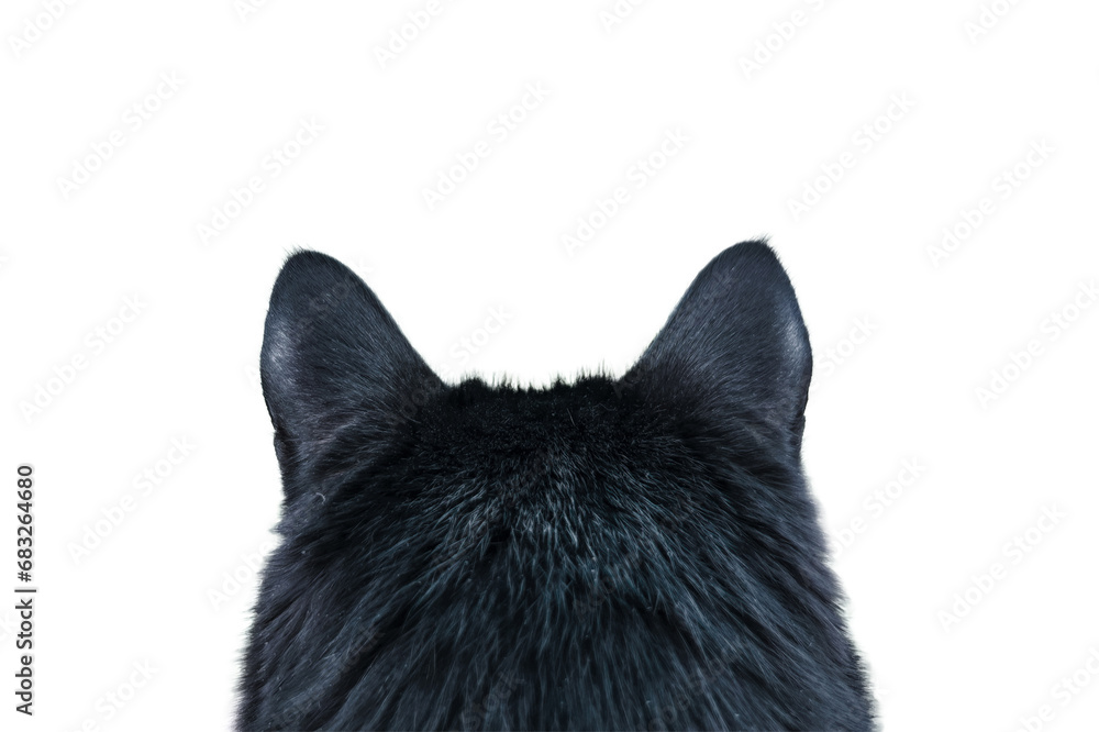 Close-up view of the cat's head from behind. Pet outdoor POV. Cat ears from behind.