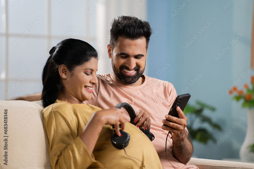 Happy indian husband with pregnant wife holding headphones on tummy by listening music her baby at home - concept of entertainment, maternity and relationship.