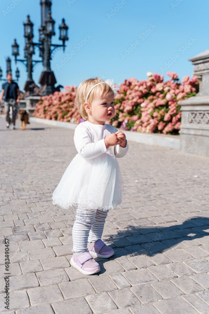 A beautiful little toddler girl in a white fluffy dress walks in a flower garden, a bright concept of holiday and summer, a very active action