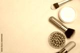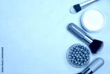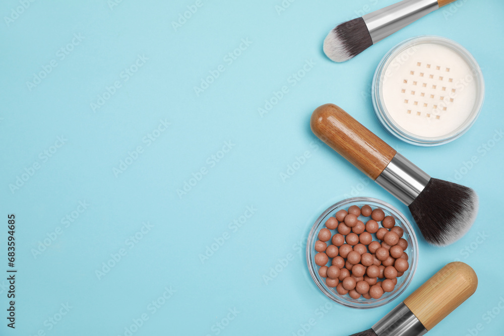 Different face powders and brushes on light blue background, flat lay. Space for text