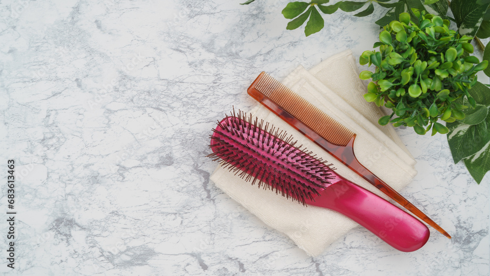 櫛(ヘアブラシ)とタオル 白い大理石背景