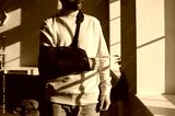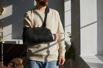 Cropped shot of man with broken arm in plaster cast. Injured man with arm wearing a arm splint bandage standing near window in office. Orthopedic medical emergency, healthcare concept