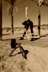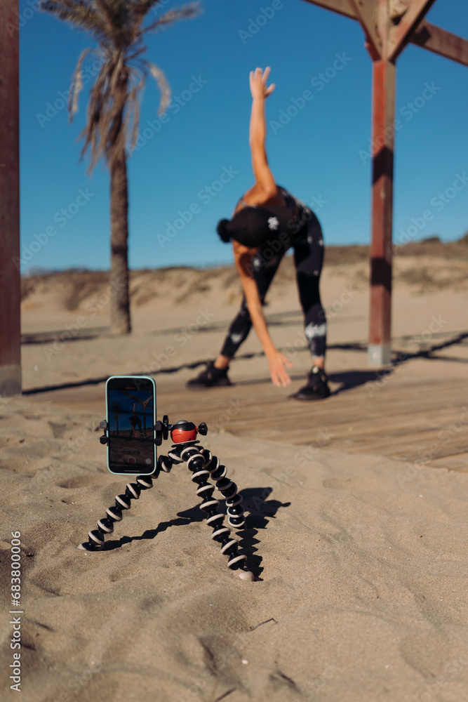 A sporty girl in a black athletic suit is doing fitness on the beach near the sea and recording herself on a mobile phone.