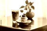 strawberry shortcake or strawberry cake with strawberry and blueberry topping and iced coffee