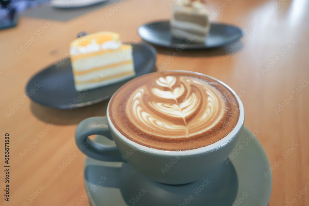 hot cofffee, cappuccino coffee or latte coffee or mocha coffee and cake