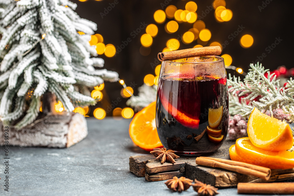 Hot red mulled wine in glass with orange, Traditional hot drink or beverage, festive cocktail