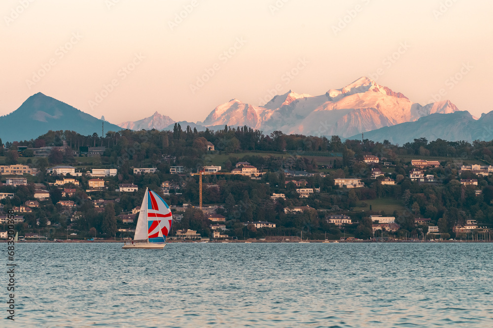 voilier sur le lac Léman et vue sur le Mont-Blanc