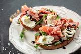 Spanish Tapas with cured Slices of jamon iberico ham. Restaurant menu, dieting, cookbook recipe top view