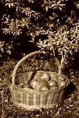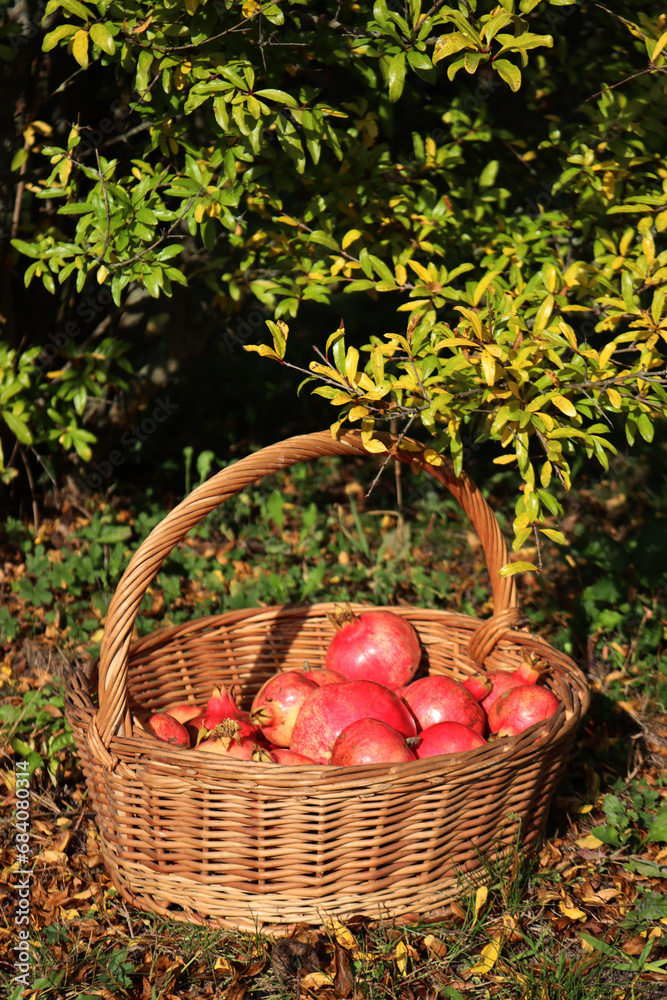 Red ripe Pomegranate fruits in a wicker basket under a Pomegranete bush with yellow leaves